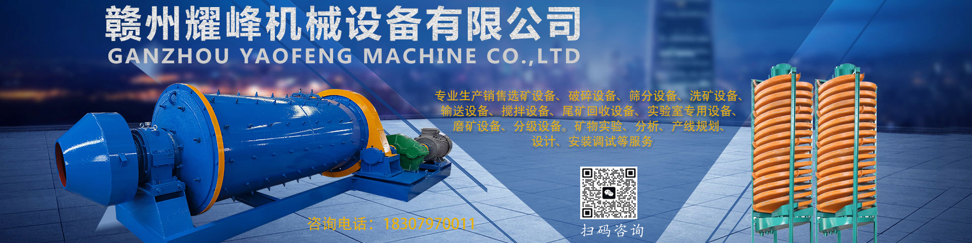赣州耀峰机械设备有限公司位于江西白莲之乡——石城县古樟工业园,公司占地面积13000平方米。主要生产、制造及销售6S摇床、螺旋溜槽、跳汰机、浮选机、分级机、球磨机、破碎机、振动筛、滚筒筛以及洗沙机等成套矿山机械设备。